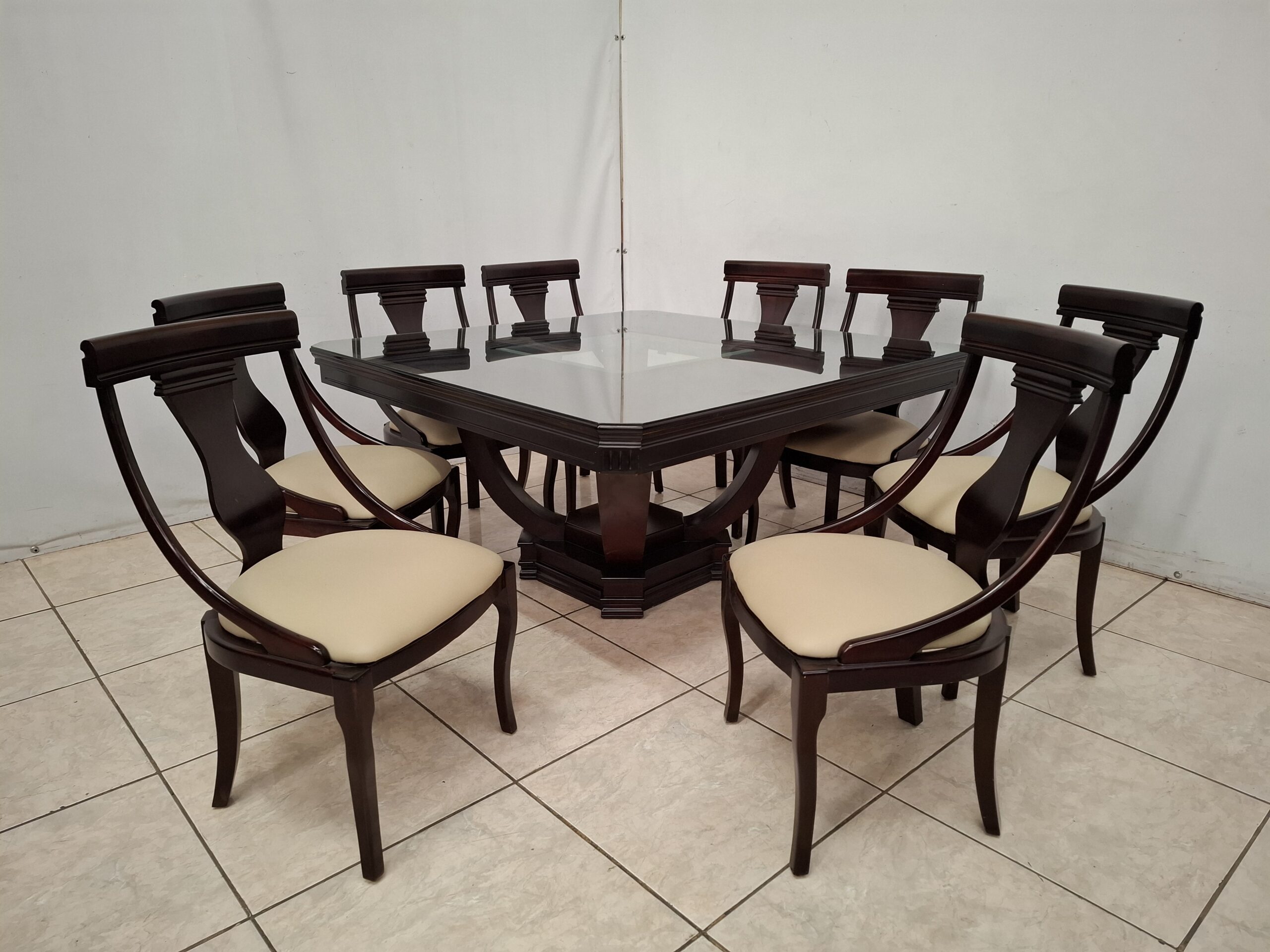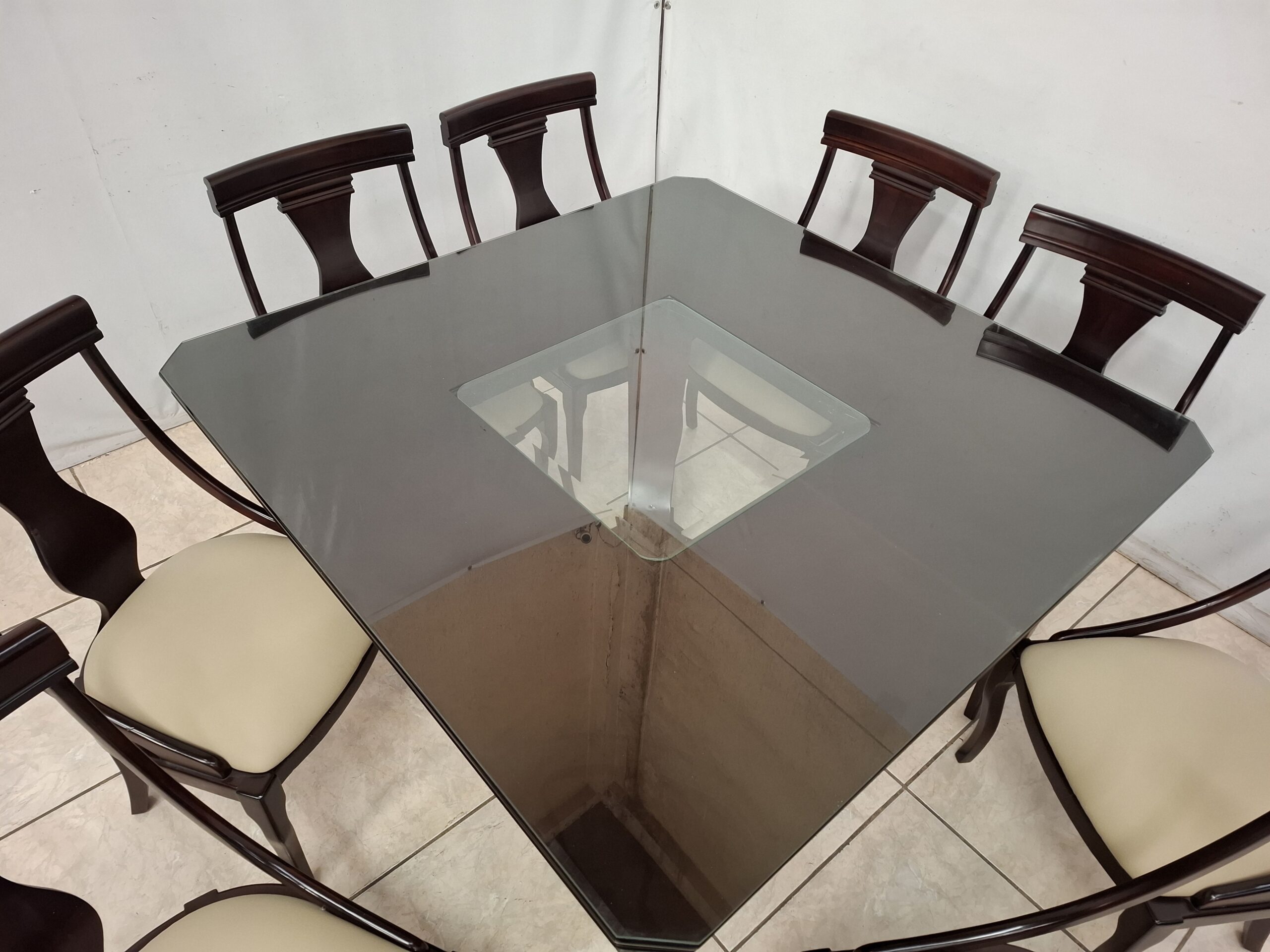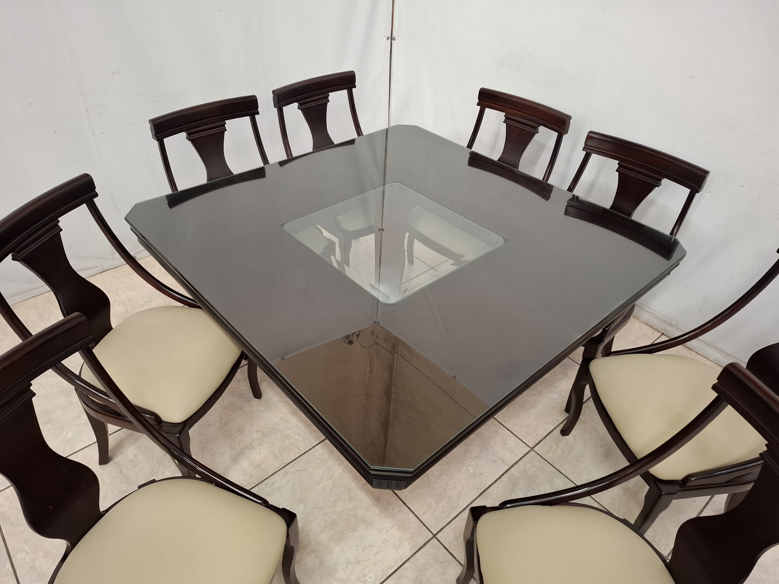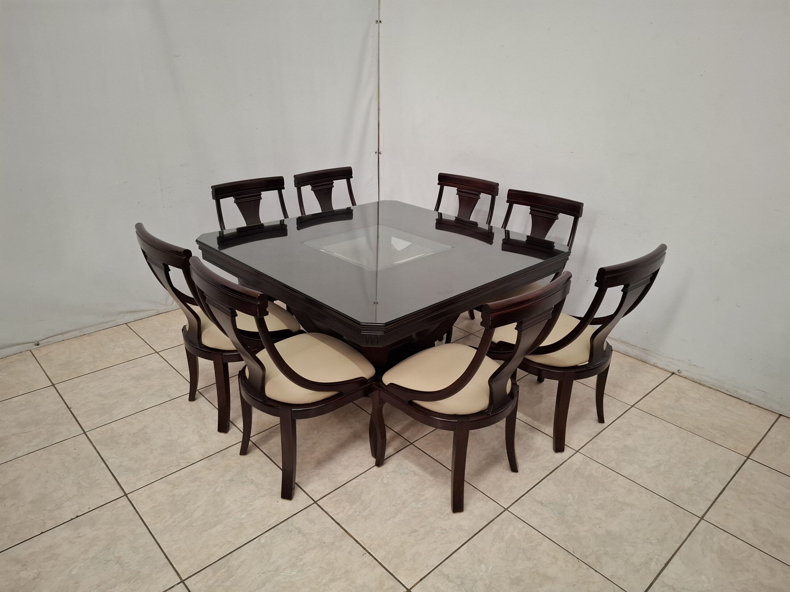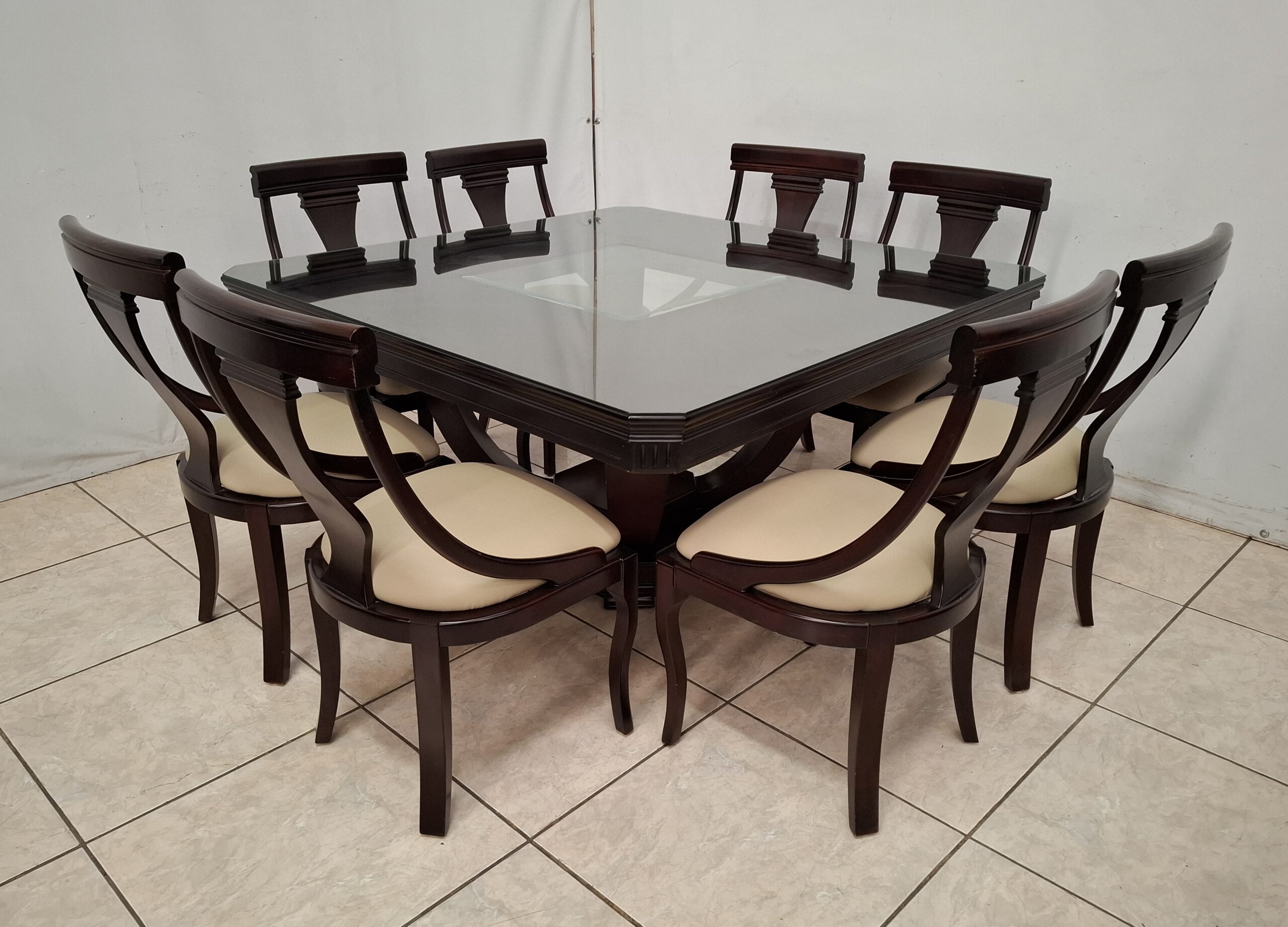 Bonito comedor color nogal usado con ocho sillas acojinadas en tactopiel y doble cristal en la superficie. De excelente calidad y en impecable condición. Mide 1.50 m de largo y 1.50 m de ancho