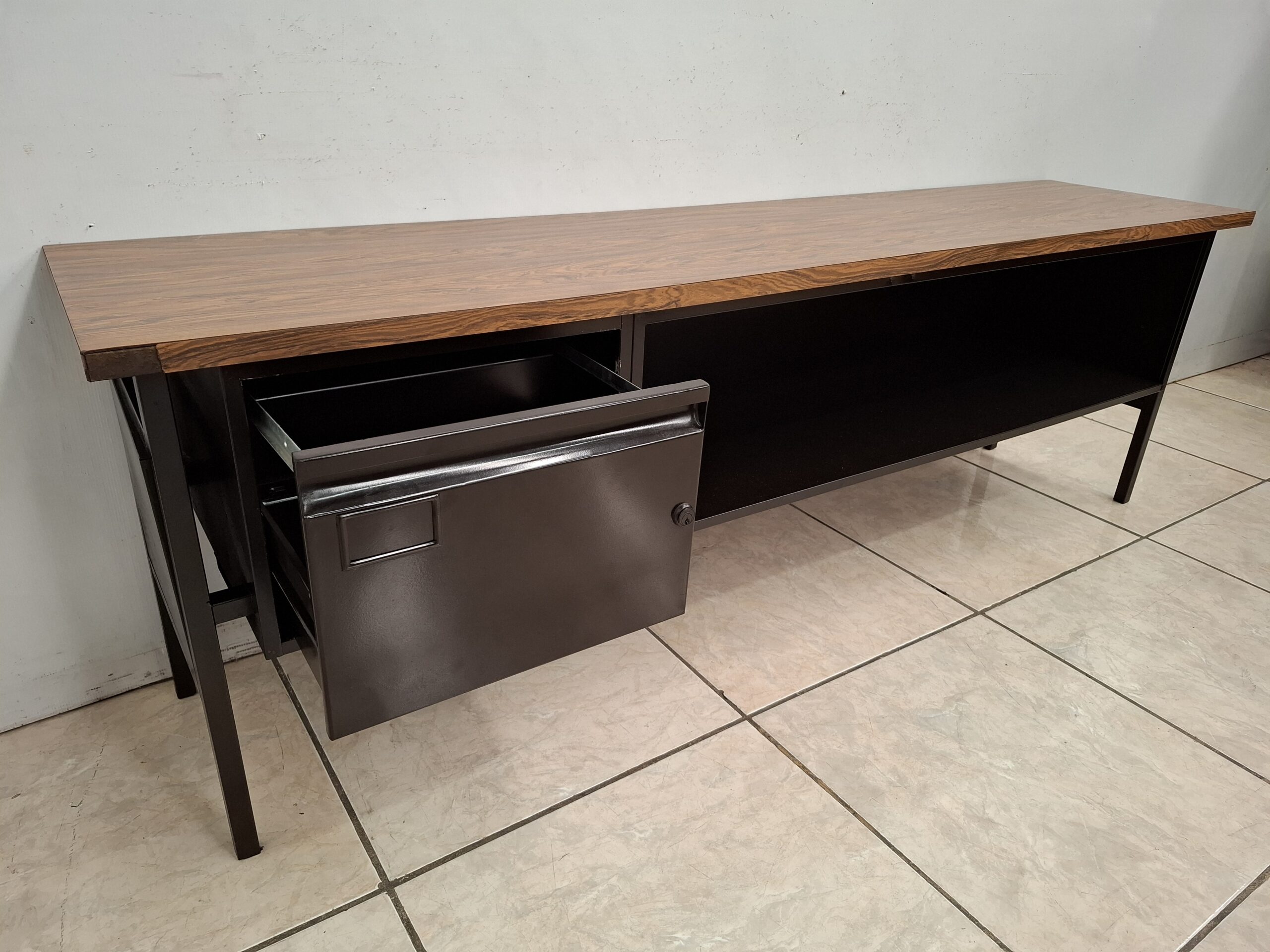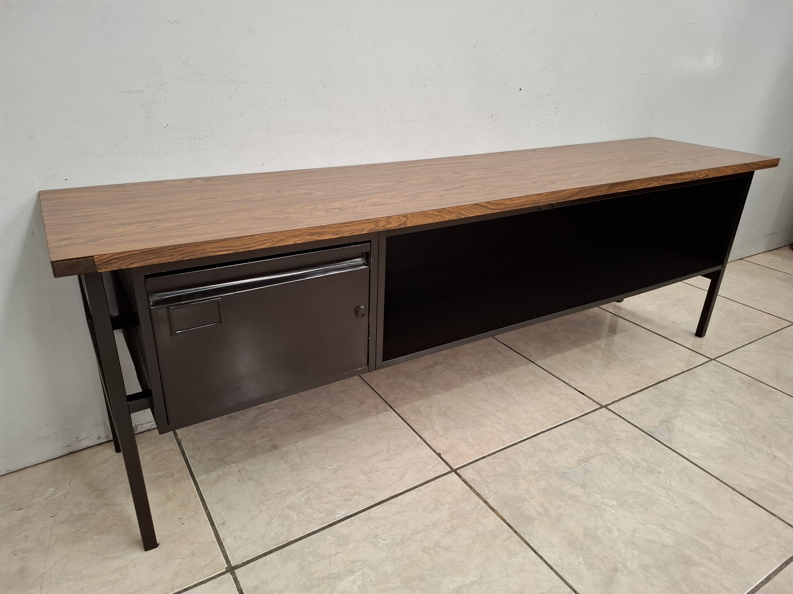 Cómoda metálica color chocolate usada con cajón y entrepaño (con ligero detalle en una esquina). Mide 2.00 m de largo, 65 cm de alto y 45 cm de ancho