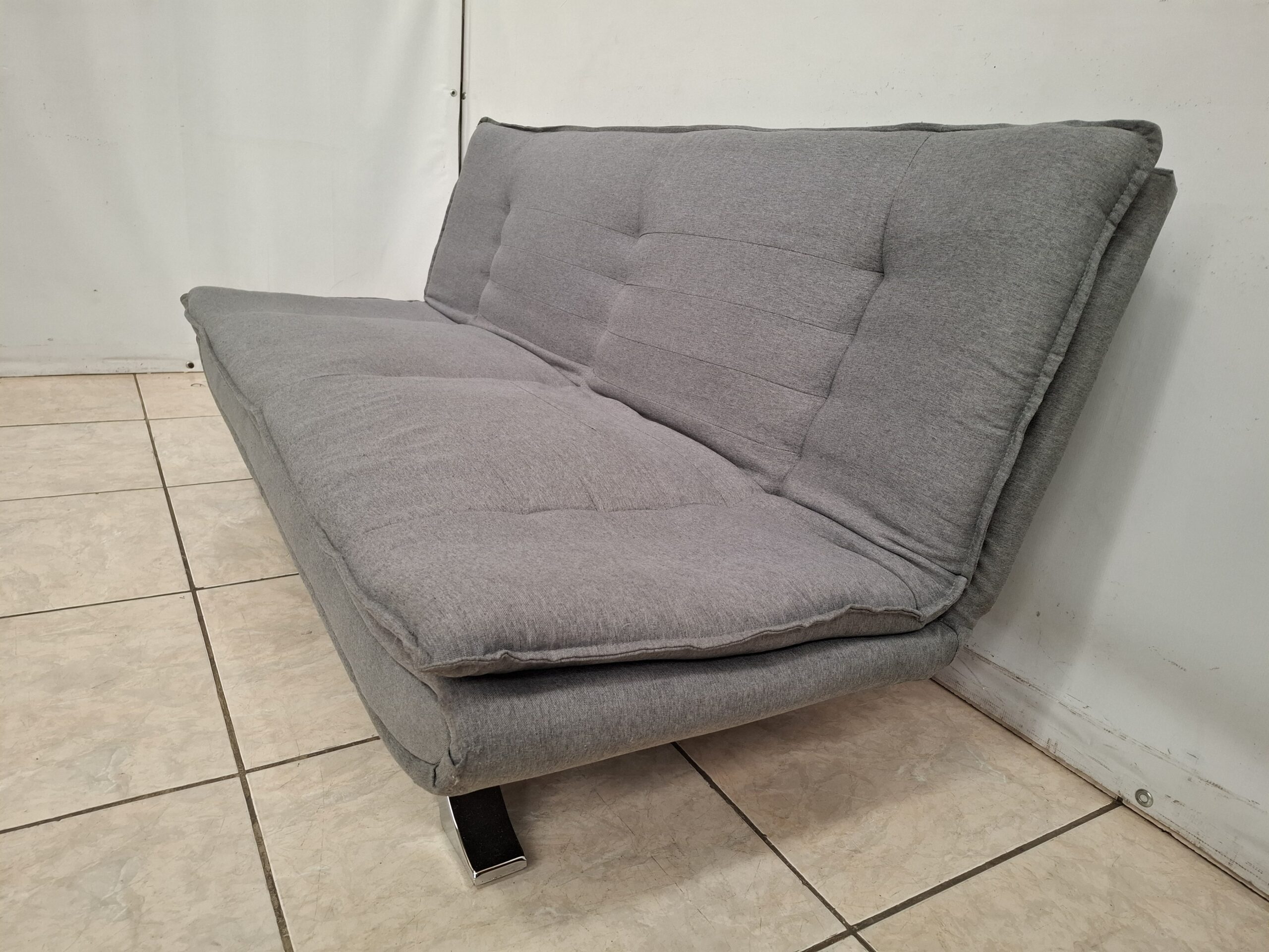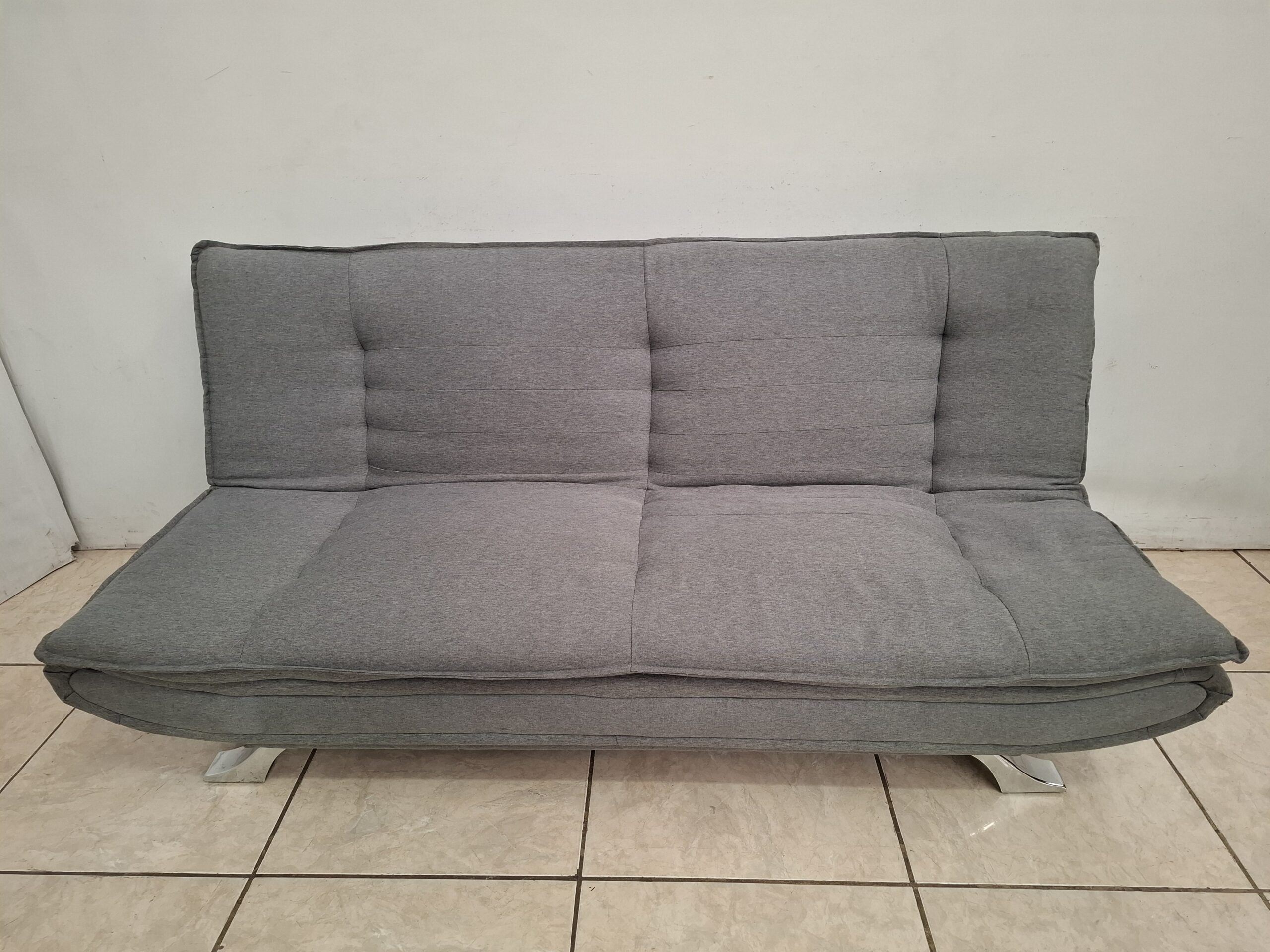 Sofá cama individual usado tapizado en tela, de tres posiciones. Mide 1.95 m de largo, 1.00 m de ancho y 85 cm de alto